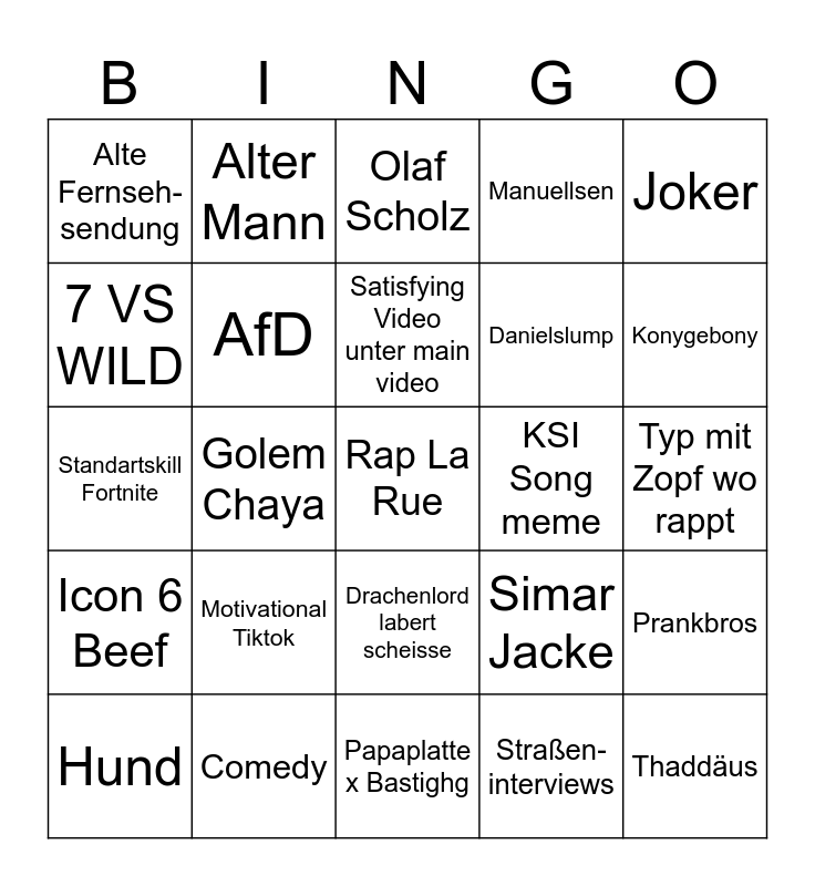 This bingo card has a free space and 24 words: Motivational Tiktok, Comedy, Satisfying Video unter main video, Hund, Joker, Alte Fernseh- sendung, 7 VS WILD, Alter Mann, KSI Song meme, Drachenlord labert scheisse, Danielslump, Standartskill Fortnite, Simar Jacke, Prankbros, AfD, Straßen-interviews, Typ mit Zopf wo rappt, Olaf Scholz, Konygebony, Golem Chaya, Thaddäus, Icon 6 Beef, Manuellsen and Papaplatte x Bastighg.