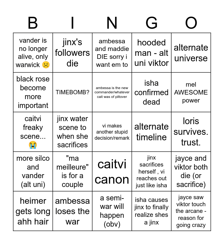 This bingo card has 25 words: "ma meilleure" is for a couple, a semi-war will happen (obv), ambessa is the new commander/whatever cait was of piltover, heimer gets long ahh hair, alternate universe, vander is no longer alive, only warwick ☹️, black rose become more important, jinx's followers die, alternate timeline, caitvi canon, isha confirmed dead, caitvi freaky scene...😭, jinx sacrifices herself , vi reaches out just like isha, jayce and viktor both die (or sacrifice), TIMEBOMB?, jayce saw viktor touch the arcane - reason for going crazy, loris survives. trust., ambessa and maddie DIE sorry i want em to, mel AWESOME power, jinx water scene to when she sacrifices, vi makes another stupid decision/remark, ambessa loses the war, more silco and vander (alt uni), hooded man - alt uni viktor and isha causes jinx to finally realize shes a jinx.