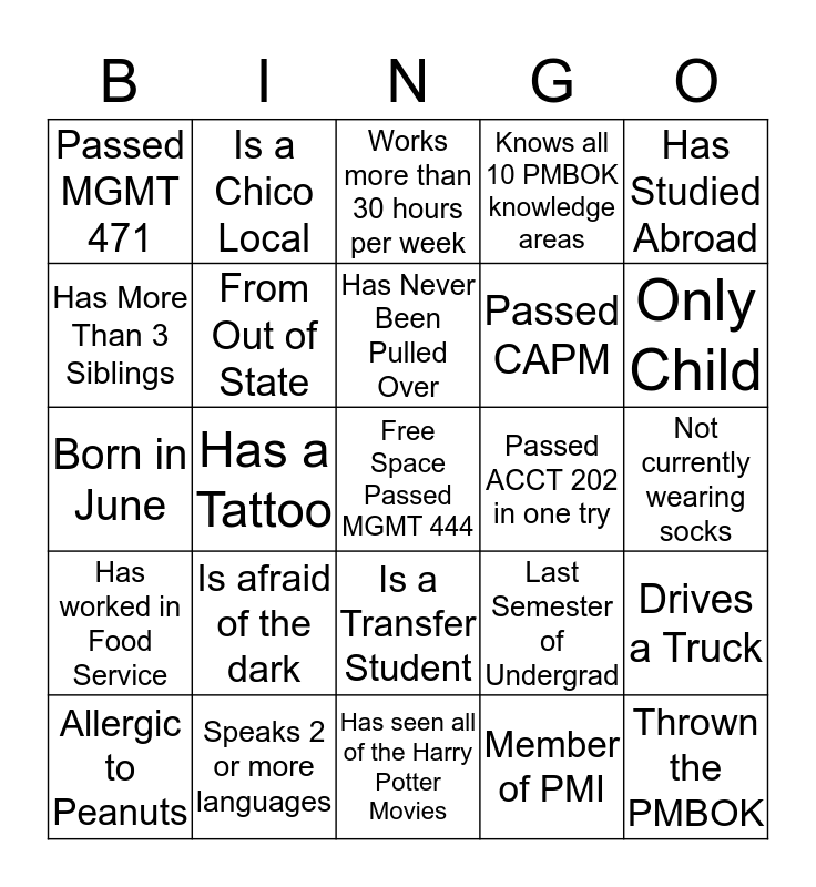 This bingo card has a free space and 24 words: Is afraid of the dark, Speaks 2 or more languages, Has Never Been Pulled Over, Allergic to Peanuts, Has Studied Abroad, Passed MGMT 471, Has More Than 3 Siblings, Is a Chico Local, Passed ACCT 202 in one try, Is a Transfer Student, Passed CAPM, Born in June, Last Semester of Undergrad, Drives a Truck, From Out of State, Member of PMI, Not currently wearing socks, Works more than 30 hours per week, Only Child, Has a Tattoo, Thrown the PMBOK, Has worked in Food Service, Knows all 10 PMBOK knowledge areas and Has seen all of the Harry Potter Movies.