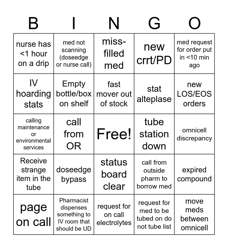 This bingo card has a free space and 62 words: survanta, Pharmacist dispenses something to IV room that should be UD, Nurse asks how long to run drug over, Receive strange item in the tube, weird/inappropriate item in return bin, compatibility question, Empty bottle/box on shelf, TPN issue, stat alteplase, temperature/pressure alarm, new crrt/PD, D/C TPN, IV hoarding stats, code response needed, picu missing med, nurse has <1 hour on a drip, move meds between omnicell, med request for order put in <10 min ago, need med from central or nurse requesting item that comes from central, fast mover out of stock, tube station down, miss-filled med, page on call, request for med to be tubed on do not tube list, retail (break-in, counseling, nurse calling wrong #), call to borrow a med, med message requesting drug in omnicell, need new tackle box, expired compound, smog compound, new chemo/chemo issue, page or call NNP, rec from a consult service, med sent secure returns in tube, omnicell discrepancy, med not scanning (doseedge or nurse call), trauma B/stab code/OB c-section, expired med (not compound), call from OR, new DKA needs bags STAT, calling maintenance or environmental services, pharm-is ticket, doseedge bypass, brand new TPN, new LOS/EOS orders, call from outside pharm to borrow med, tube shut down for full tube, request for vfc vaccine, recon antibiotic, ID home med, status board clear, request for on call electrolytes, omnicell issue, med message requesting med scanned into med bin, phone call from MD needing dose recommendation, need to make dilution narc, nurse calls and asks for med to be approved, epic queue clear, Door bell to pharmacy, IV room calls out for stock, DE rework and need to waste for a narc.