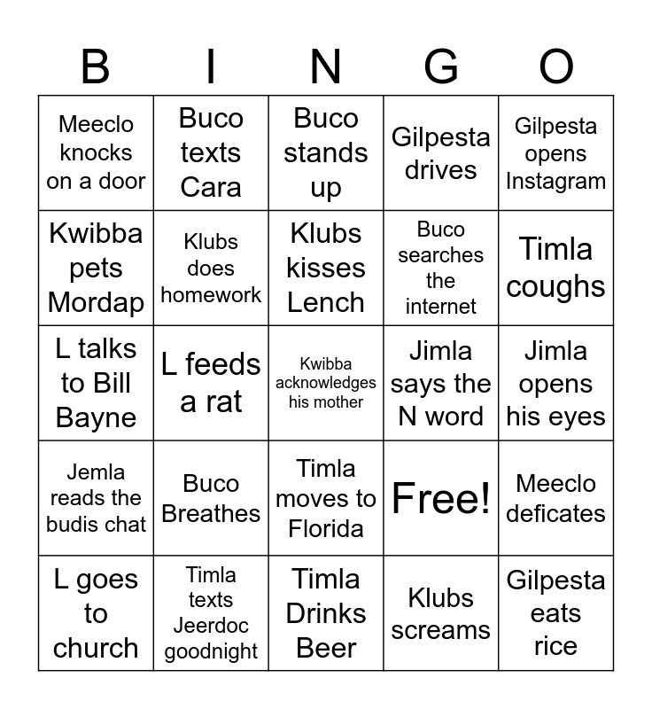 This bingo card has 25 words: Buco Breathes, Timla Drinks Beer, Klubs kisses Lench, L goes to church, Gilpesta opens Instagram, Meeclo knocks on a door, Kwibba pets Mordap, Buco texts Cara, Jimla says the N word, Timla moves to Florida, Buco searches the internet, L talks to Bill Bayne, Free!, Meeclo deficates, Klubs does homework, Gilpesta eats rice, Jimla opens his eyes, Buco stands up, Timla coughs, L feeds a rat, Kwibba acknowledges his mother, Timla texts Jeerdoc goodnight, Jemla reads the budis chat, Gilpesta drives and Klubs screams.