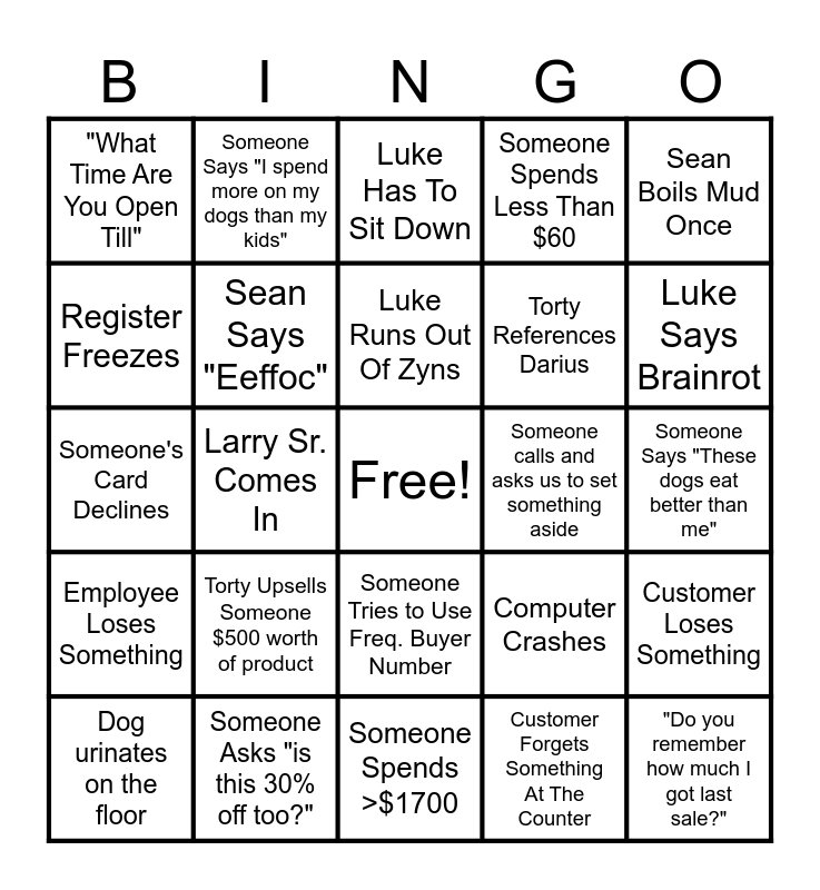 This bingo card has a free space and 24 words: Torty Upsells Someone $500 worth of product, Someone Asks "is this 30% off too?", Luke Runs Out Of Zyns, Dog urinates on the floor, Sean Boils Mud Once, "What Time Are You Open Till", Register Freezes, Someone Says "I spend more on my dogs than my kids", Someone calls and asks us to set something aside, Someone Tries to Use Freq. Buyer Number, Torty References Darius, Someone's Card Declines, Computer Crashes, Customer Loses Something, Sean Says "Eeffoc", Customer Forgets Something At The Counter, Someone Says "These dogs eat better than me", Luke Has To Sit Down, Luke Says Brainrot, Larry Sr. Comes In, "Do you remember how much I got last sale?", Employee Loses Something, Someone Spends Less Than $60 and Someone Spends >$1700.
