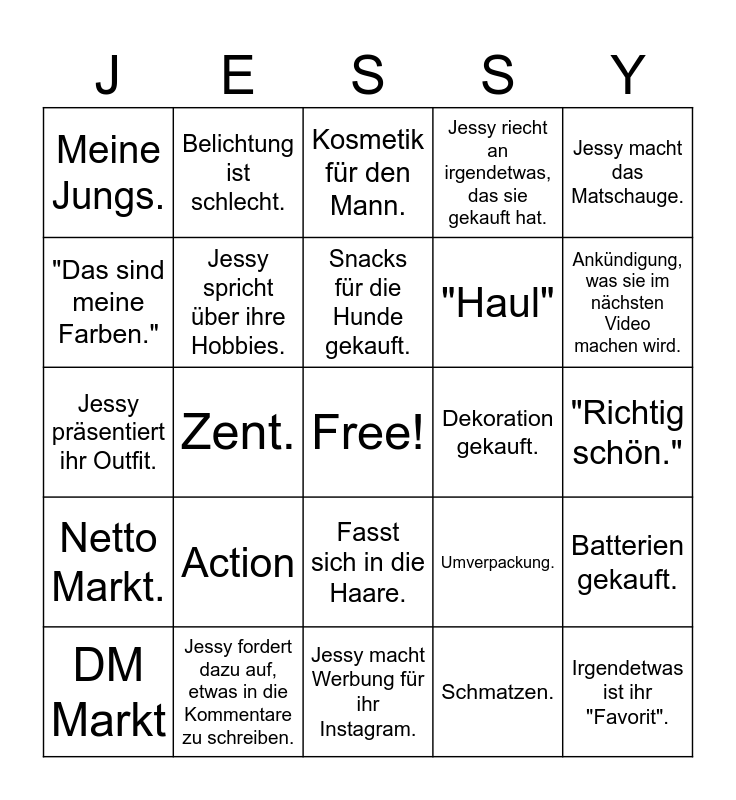 This bingo card has a free space and 24 words: Action, Jessy fordert dazu auf, etwas in die Kommentare zu schreiben., Snacks für die Hunde gekauft., DM Markt, Jessy macht das Matschauge., Meine Jungs., "Das sind meine Farben.", Belichtung ist schlecht., Dekoration gekauft., Fasst sich in die Haare., "Haul", Jessy präsentiert ihr Outfit., Umverpackung., Batterien gekauft., Jessy spricht über ihre Hobbies., Schmatzen., "Richtig schön.", Kosmetik für den Mann., Ankündigung, was sie im nächsten Video machen wird., Zent., Irgendetwas ist ihr "Favorit"., Netto Markt., Jessy riecht an irgendetwas, das sie gekauft hat. and Jessy macht Werbung für ihr Instagram..