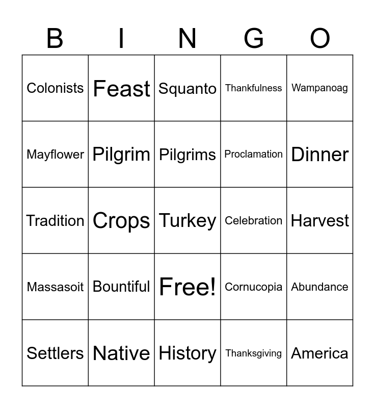 This bingo card has 26 words: Free!, Thanksgiving, Pilgrims, Native, Wampanoag, Colonists, Mayflower, Feast, Harvest, Cornucopia, Proclamation, Tradition, Abundance, Settlers, Crops, 1621, Thankfulness, Massasoit, Squanto, Turkey, Dinner, History, Celebration, Bountiful, Pilgrim and America.