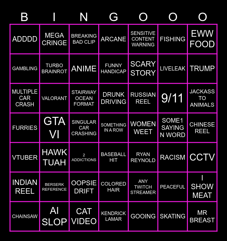 This bingo card has a free space and 48 words: ANY TWITCH STREAMER, LIVELEAK, KENDRICK LAMAR, GTA VI, STAIRWAY OCEAN FORMAT, CHINESE REEL, MEGA CRINGE, AI SLOP, FISHING, BASEBALL HIT, EWW FOOD, ARCANE, 9/11, RUSSIAN REEL, INDIAN REEL, SOME1 SAYING N WORD, GAMBLING, TRUMP, PEACEFUL, SENSITIVE CONTENT WARNING, SCARY STORY, SINGULAR CAR CRASHING, ADDDD, TURBO BRAINROT, I SHOW MEAT, ANIME, JACKASS TO ANIMALS, CHAINSAW, DRUNK DRIVING, VALORANT, SKATING, WOMEN WEET, CCTV, BERSERK REFERENCE, FURRIES, RYAN REYNOLD, RACISM, MULTIPLE CAR CRASH, 2 ADDICTIONS, OOPSIE DRIFT, VTUBER, MR BREAST, BREAKING BAD CLIP, CAT VIDEO, FUNNY HANDICAP, COLORED HAIR, HAWK TUAH and GOOING.