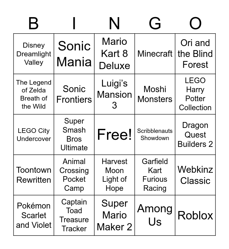 This bingo card has a free space and 74 words: Super Mario Odyssey, Animal Crossing New Horizons, Mario Kart 8 Deluxe, Kirby and the Forgotten Land, Donkey Kong Country Tropical Freeze, Yoshi’s Crafted World, New Super Mario Bros U Deluxe, Splatoon 3, Pokémon Scarlet and Violet, Pokémon Legends Arceus, Pokémon Let’s Go Pikachu and Let’s Go Eevee, Pikmin 4, Luigi’s Mansion 3, The Legend of Zelda Breath of the Wild, The Legend of Zelda Tears of the Kingdom, Super Smash Bros Ultimate, LEGO Star Wars The Skywalker Saga, LEGO Harry Potter Collection, LEGO Marvel Super Heroes, LEGO City Undercover, Sonic Frontiers, Sonic Mania, Minecraft, Terraria, Roblox, Crash Bandicoot N Sane Trilogy, Spyro Reignited Trilogy, Shovel Knight, Cuphead, Hollow Knight, Ori and the Blind Forest, Ori and the Will of the Wisps, Sackboy A Big Adventure, LittleBigPlanet 3, Brawlhalla, Among Us, Fall Guys, Tetris Effect Connected, Just Dance 2024, Mario Party Superstars, Super Mario Maker 2, Captain Toad Treasure Tracker, Adventure Time Pirates of the Enchiridion, Paw Patrol Mighty Pups Save Adventure Bay, Peppa Pig World Adventures, Disney Dreamlight Valley, My Friend Peppa Pig, Animal Crossing Pocket Camp, Pokémon Snap, Pokémon Mystery Dungeon Rescue Team DX, Plants vs Zombies Battle for Neighborville, Yo-kai Watch, Dragon Quest Builders 2, Cooking Mama Cookstar, Story of Seasons Friends of Mineral Town, Story of Seasons Pioneers of Olive Town, Harvest Moon Light of Hope, Viva Piñata, Club Penguin Island, Webkinz Classic, Moshi Monsters, Poptropica, Toontown Rewritten, Scribblenauts Unlimited, Scribblenauts Showdown, Nintendogs + Cats, Tamagotchi Party On, Nickelodeon Kart Racers 3, Garfield Kart Furious Racing, The Smurfs Mission Vileaf, Ice Age Scrat’s Nutty Adventure, LEGO Worlds, Disney Infinity and Skylanders Imaginators.