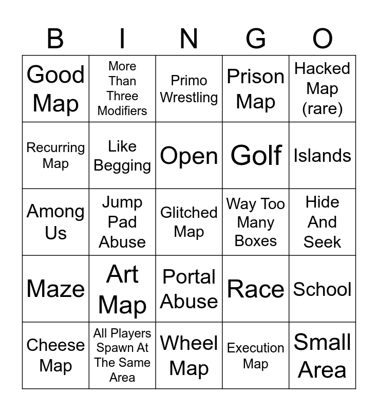 This bingo card has a free space and 24 words: Art Map, All Players Spawn At The Same Area, Open, Cheese Map, Hacked Map (rare), Good Map, Recurring Map, More Than Three Modifiers, Way Too Many Boxes, Portal Abuse, Golf, Among Us, Race, School, Like Begging, Execution Map, Hide And Seek, Primo Wrestling, Islands, Jump Pad Abuse, Small Area, Maze, Prison Map and Wheel Map.