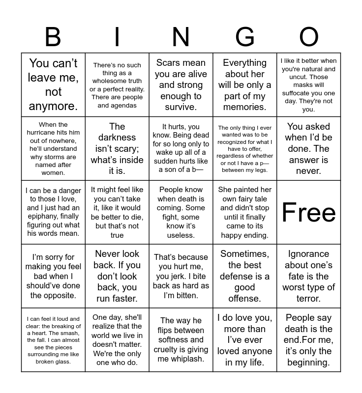 This bingo card has 25 words: Never look back. If you don’t look back, you run faster., The way he flips between softness and cruelty is giving me whiplash., It hurts, you know. Being dead for so long only to wake up all of a sudden hurts like a son of a b—, I can feel it loud and clear: the breaking of a heart. The smash, the fall. I can almost see the pieces surrounding me like broken glass., I like it better when you're natural and uncut. Those masks will suffocate you one day. They're not you., You can’t leave me, not anymore., When the hurricane hits him out of nowhere, he’ll understand why storms are named after women., There’s no such thing as a wholesome truth or a perfect reality. There are people and agendas, She painted her own fairy tale and didn't stop until it finally came to its happy ending., That’s because you hurt me, you jerk. I bite back as hard as I’m bitten., The only thing I ever wanted was to be recognized for what I have to offer, regardless of whether or not I have a p— between my legs., I can be a danger to those I love, and I just had an epiphany, finally figuring out what his words mean., Sometimes, the best defense is a good offense., Ignorance about one’s fate is the worst type of terror., The darkness isn’t scary; what’s inside it is., People say death is the end.For me, it’s only the beginning., Free, Scars mean you are alive and strong enough to survive., You asked when I’d be done. The answer is never., It might feel like you can’t take it, like it would be better to die, but that’s not true, People know when death is coming. Some fight, some know it’s useless., One day, she'll realize that the world we live in doesn't matter. We're the only one who do., I’m sorry for making you feel bad when I should’ve done the opposite., Everything about her will be only a part of my memories. and I do love you, more than I’ve ever loved anyone in my life..