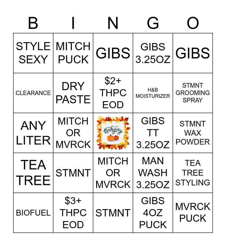 This bingo card has a free space and 31 words: STMNT, TEA TREE, MITCH OR MVRCK, CREW, STYLE SEXY, GIBS, DRY PASTE, MAN WASH 3.25OZ, GIBS TT 3.25OZ, GIBS 4OZ PUCK, STMNT WAX POWDER, MVRCK PUCK, BEARD OIL/BALM, CLEARANCE, STMNT GROOMING SPRAY, GIBS TT, TEA TREE STYLING, STMNT, TEA TREE, MITCH OR MVRCK, GIBS, CONMAN, BIOFUEL, MITCH PUCK, H&B MOISTURIZER, CLEARANCE, GIBS 3.25OZ, ANY LITER, $3+ THPC EOD, $2+ THPC EOD and $4+ THPC EOD.