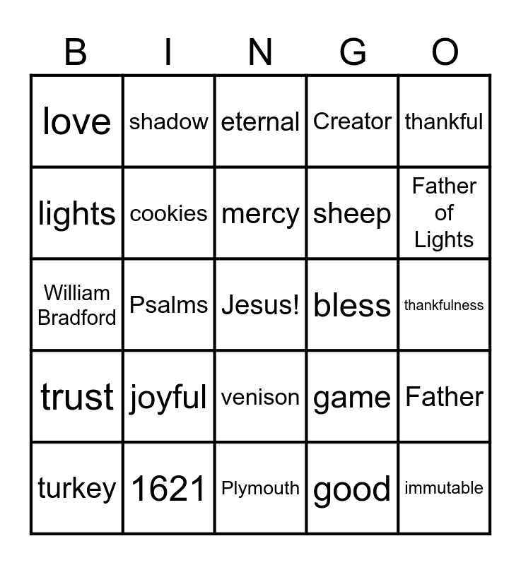 This bingo card has a free space and 29 words: turkey, praise, Psalms, everything, love, eternal, cookies, joyful, bless, 1621, thankfulness, immutable, Plymouth, good, Father of Lights, pie, venison, trust, thankful, William Bradford, game, give, sheep, lights, Creator, shadow, Father, mercy and pray.