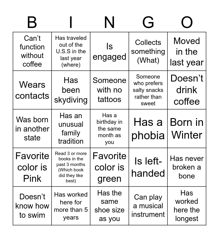 This bingo card has 48 words: Free!, Has a birthday in the same month as you, Is an only child, Has the same shoe size as you, Read 3 or more books in the past 3 months (Which book did they like best), Has been to the movies in the last 2 weeks (What did they see), Has traveled out of the U.S.S in the last year (where), Someone who can whistle, Wears contacts, Met a celebrity (who), Has been skydiving, Collects something (What), Has never broken a bone, Is left-handed, Someone who speaks more than one language, Someone who has more than 4 tattoos, Someone with no tattoos, Has a phobia, Named after a relative, Moved in the last year, Has an unusual family tradition, Can play a musical instrument, Can’t function without coffee, Someone who prefers salty snacks rather than sweet, Born in Summer, Doesn’t drink coffee, Doesn’t know how to swim, Favorite color is purple, Favorite color is green, Favorite color is Pink, Favorite Color is Blue, Favorite color is yellow, Is the youngest child, Doesn’t Drink Milk, Has worked here for more than 5 years, Has the furthest commute to work, Is a night owl, Born in Winter, Born in Fall, Born in Spring, Has a Birthday Next Month, Has worked here the longest, Is engaged, Doesn’t have social media, Was born in another state, Someone who is always hot, Someone who is always cold and Someone who is always late.