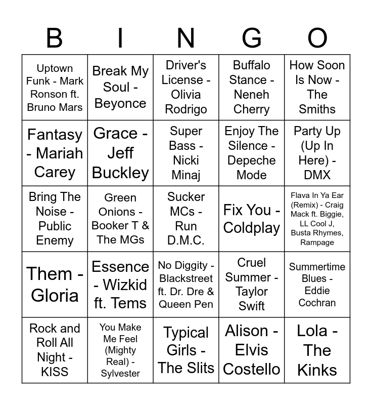 This bingo card has 65 words: Limelight - Rush, Sheena Is A Punk Rocker - The Ramones, West End Girls - Pet Shop Boys, Summertime Blues - Eddie Cochran, They Reminisce Over You (T.R.O.Y.) - Pete Rock & CL Smooth, Under Pressure - Queen & David Bowie, Break My Soul - Beyonce, Rapper's Delight - Sugarhill Gang, Super Bass - Nicki Minaj, Mannish Boy - Muddy Waters, No Diggity - Blackstreet ft. Dr. Dre & Queen Pen, Criminal - Fiona Apple, Flava In Ya Ear (Remix) - Craig Mack ft. Biggie, LL Cool J, Busta Rhymes, Rampage, How Soon Is Now - The Smiths, California Dreamin' - The Mamas And The Papas, Fantasy - Mariah Carey, Green Onions - Booker T & The MGs, Uptown Funk - Mark Ronson ft. Bruno Mars, Alive - Pearl Jam, Enjoy The Silence - Depeche Mode, Essence - Wizkid ft. Tems, Them - Gloria, Buffalo Stance - Neneh Cherry, Heavy Metal Drummer - Wilco, Whipping Post -Allman Bros. Band, Everlong - Foo Fighters, Father And Son - Cat Stevens, Free Bird - Lynyrd Skynyrd, Sucker MCs - Run D.M.C., Amor Prohibido - Selena, Rock and Roll All Night - KISS, Ain't Nobody - Rufus & Chaka Khan, ‘Ella Baila Sola’ - Eslabon Armado and Peso Pluma,, Go Your Own Way - Fleetwood Mac, Cruel Summer - Taylor Swift, You Make Me Feel (Mighty Real) - Sylvester, Hungry Like The Wolf - Duran Duran, Bring The Noise - Public Enemy, Alison - Elvis Costello, Planet Rock - Afrika Bambaata & Soulsonic Force, Grace - Jeff Buckley, Say It Loud (I'm Black & I'm Proud) - James Brown, Fix You - Coldplay, Springsteen - Eric Church, Enter Sandman - Metallica, Brass In Pocket - The Pretenders, Party Up (Up In Here) - DMX, Personality Crisis - New York Dolls, Lola - The Kinks, I'm Coming Out - Diana Ross, I Like It - Cardi B, Bad Bunny & J Balvin, Redbone - Childish Gambino, Paper Bag - Fiona Apple, Typical Girls - The Slits, Radiation Vibe - Fountains of Wayne, Untitled (How Does It Feel) - D'Angelo, Mr. Brightside - The Killers, Driver's License - Olivia Rodrigo, Mama Tried - Merle Haggard, Up On The Roof - The Drifters, Be Thankful For What You Got - William DeVaughn, Hotline Bling - Drake, I Can't Make You Love Me - Bonnie Raitt, Bennie & The Jets - Elton John and Adore - Prince.