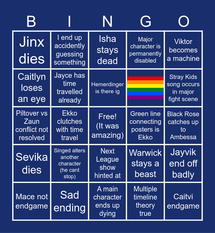 This bingo card has 1 images, a free space and 23 words: Singed alters another character (he cant stop), Sad ending, Hemerdinger is there ig, Mace not endgame, Viktor becomes a machine, Jinx dies, Caitlyn loses an eye, I end up accidently guessing something, Green line connecting posters is Ekko, Next League show hinted at, Piltover vs Zaun conflict not resolved, Warwick stays a beast, Jayvik end off badly, Jayce has time travelled already, Multiple timeline theory true, Black Rose catches up to Ambessa, Isha stays dead, Stray Kids song occurs in major fight scene, Ekko clutches with time travel, Caitvi endgame, Sevika dies, Major character is permanently disabled and A main character ends up dying.