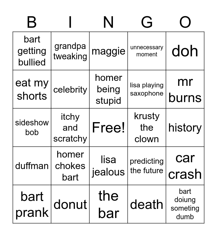 This bingo card has a free space and 24 words: homer chokes bart, donut, homer being stupid, bart prank, doh, bart getting bullied, eat my shorts, grandpa tweaking, krusty the clown, lisa jealous, lisa playing saxophone, sideshow bob, predicting the future, car crash, celebrity, death, history, maggie, mr burns, itchy and scratchy, bart doiung someting dumb, duffman, unnecessary moment and the bar.