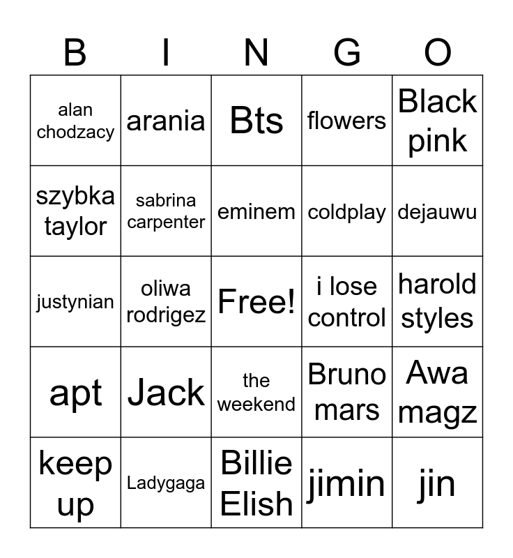 This bingo card has a free space and 24 words: Jack, Ladygaga, eminem, keep up, Black pink, alan chodzacy, szybka taylor, arania, i lose control, the weekend, coldplay, justynian, Bruno mars, Awa magz, sabrina carpenter, jimin, harold styles, Bts, dejauwu, oliwa rodrigez, jin, apt, flowers and Billie Elish.