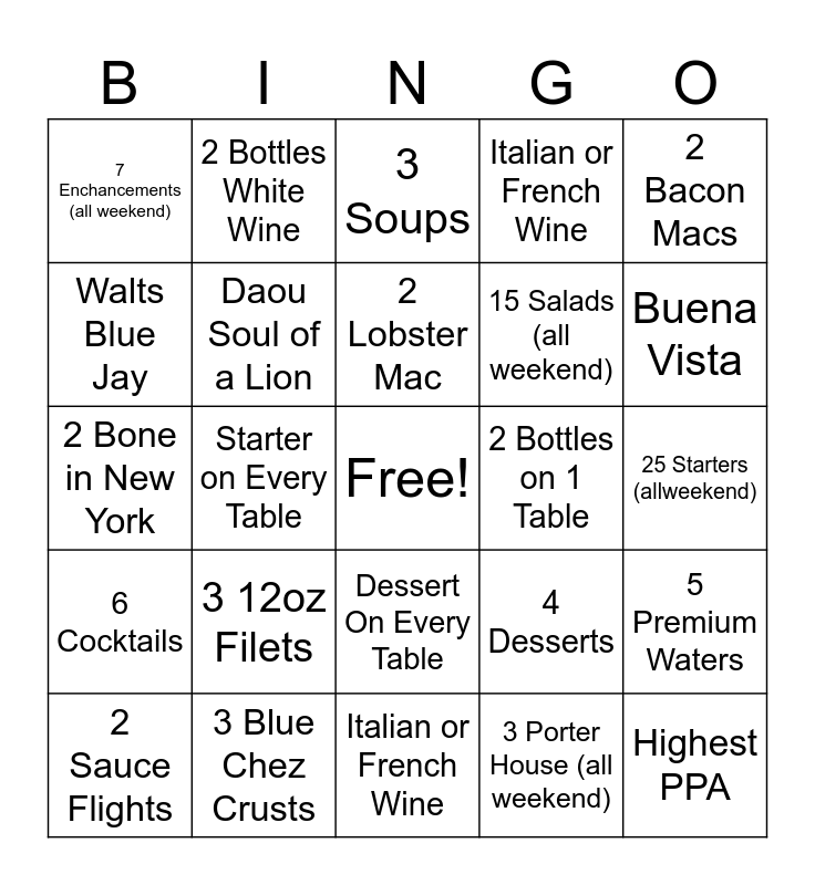 This bingo card has a free space and 24 words: 3 12oz Filets, 3 Blue Chez Crusts, 2 Lobster Mac, 2 Sauce Flights, 2 Bacon Macs, 7 Enchancements (all weekend), Walts Blue Jay, 2 Bottles White Wine, 2 Bottles on 1 Table, Dessert On Every Table, 15 Salads (all weekend), 2 Bone in New York, 4 Desserts, 5 Premium Waters, Daou Soul of a Lion, 3 Porter House (all weekend), 25 Starters (allweekend), 3 Soups, Buena Vista, Starter on Every Table, Highest PPA, 6 Cocktails, Italian or French Wine and Italian or French Wine.
