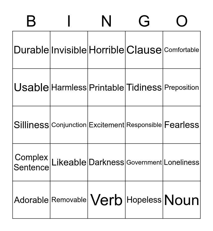 This bingo card has a free space and 24 words: Likeable, Removable, Printable, Adorable, Comfortable, Durable, Usable, Invisible, Responsible, Darkness, Tidiness, Silliness, Government, Loneliness, Harmless, Hopeless, Fearless, Horrible, Preposition, Conjunction, Noun, Complex Sentence, Clause and Verb.