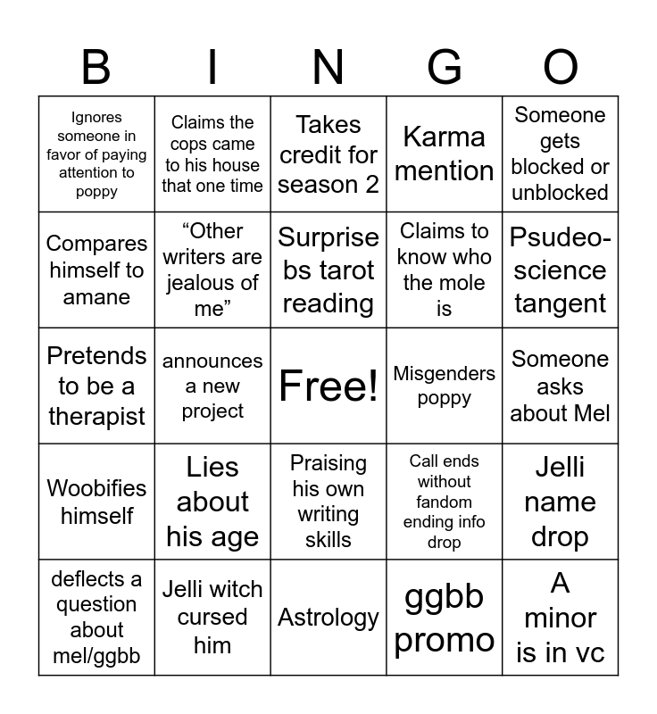 This bingo card has a free space and 24 words: Lies about his age, Jelli witch cursed him, Surprise bs tarot reading, deflects a question about mel/ggbb, Someone gets blocked or unblocked, Ignores someone in favor of paying attention to poppy, Compares himself to amane, Claims the cops came to his house that one time, Misgenders poppy, Praising his own writing skills, Claims to know who the mole is, Pretends to be a therapist, Call ends without fandom ending info drop, Jelli name drop, “Other writers are jealous of me”, ggbb promo, Someone asks about Mel, Takes credit for season 2, Psudeo-science tangent, announces a new project, A minor is in vc, Woobifies himself, Karma mention and Astrology.