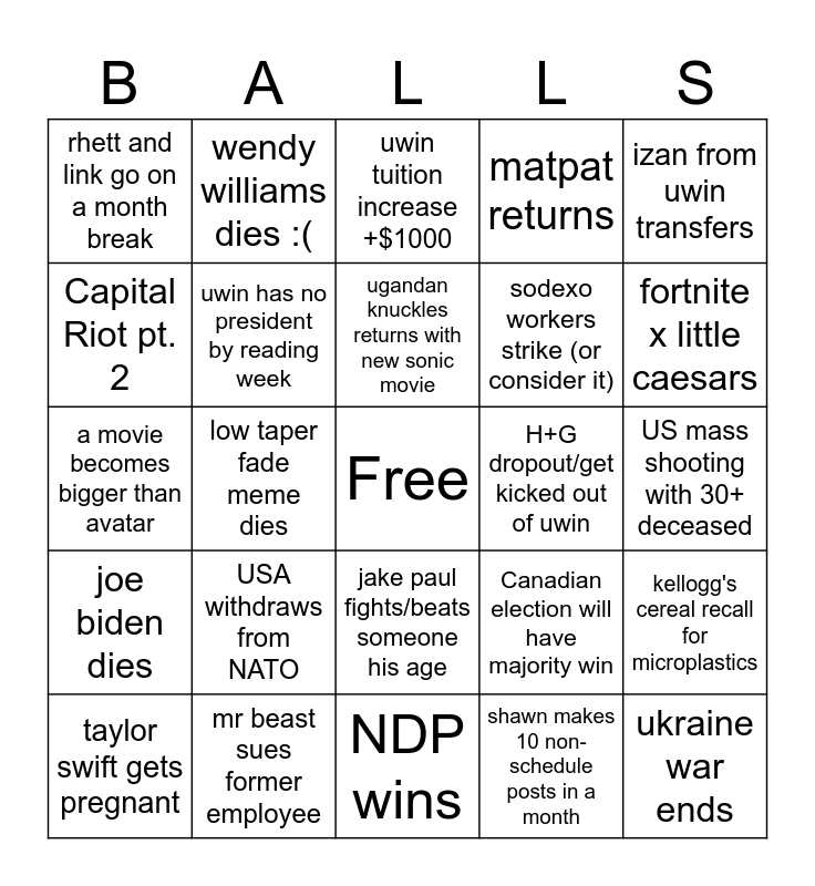 This bingo card has a free space and 24 words: USA withdraws from NATO, mr beast sues former employee, ugandan knuckles returns with new sonic movie, taylor swift gets pregnant, izan from uwin transfers, rhett and link go on a month break, Capital Riot pt. 2, wendy williams dies :(, H+G dropout/get kicked out of uwin, jake paul fights/beats someone his age, sodexo workers strike (or consider it), a movie becomes bigger than avatar, Canadian election will have majority win, kellogg's cereal recall for microplastics, uwin has no president by reading week, shawn makes 10 non-schedule posts in a month, US mass shooting with 30+ deceased, uwin tuition increase +$1000, fortnite x little caesars, low taper fade meme dies, ukraine war ends, joe biden dies, matpat returns and NDP wins.
