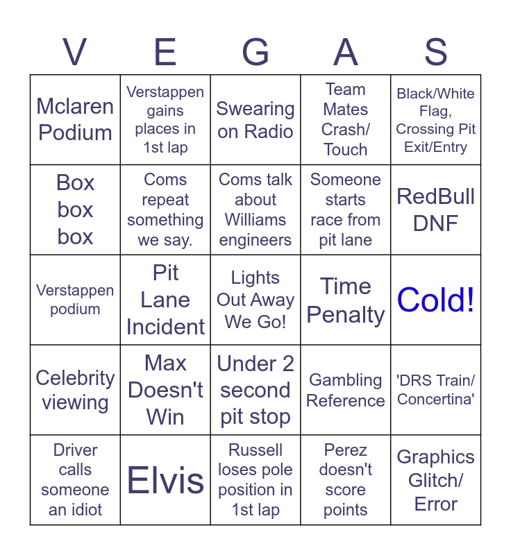 This bingo card has a free space and 36 words: RED FLAG!, Safety Car!, Someone hits the wall, Coms repeat something we say., Gambling Reference, Celebrity viewing, Coms talk about Williams engineers, Manhole cover, Black/White Flag, Crossing Pit Exit/Entry, Three Or More DNF's, Pit Lane Incident, Team Mates Crash/ Touch, Over 5 Second Pitstop, Time Penalty, RedBull DNF, Mclaren Podium, "Tyres are gone/ No Grip!", Max Doesn't Win, Graphics Glitch/ Error, Swearing on Radio, Cold!, 'DRS Train/ Concertina', Elvis, Driver calls someone an idiot, Russell loses pole position in 1st lap, Verstappen gains places in 1st lap, Verstappen podium, Tsunoda scores points, Someone starts race from pit lane, Box box box, Russell beats Hamilton, Ferrari drivers battle each other, Perez doesn't score points, Under 2 second pit stop, Zach Brown on radio and Gasly gets passed in first 5 laps.