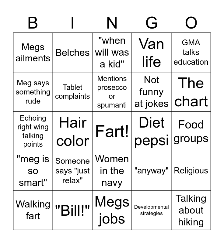 This bingo card has a free space and 24 words: Someone says "just relax", "Bill!", Mentions prosecco or spumanti, Walking fart, GMA talks education, Megs ailments, Meg says something rude, Belches, Diet pepsi, Women in the navy, Not funny at jokes, Echoing right wing talking points, "anyway", Religious, Tablet complaints, Developmental strategies, Food groups, "when will was a kid", The chart, Hair color, Talking about hiking, "meg is so smart", Van life and Megs jobs.