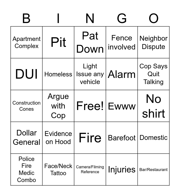 This bingo card has a free space and 24 words: Evidence on Hood, Face/Neck Tattoo, Light Issue any vehicle, Police Fire Medic Combo, Neighbor Dispute, Apartment Complex, DUI, Pit, Ewww, Fire, Alarm, Construction Cones, Barefoot, Domestic, Homeless, Injuries, No shirt, Pat Down, Cop Says Quit Talking, Argue with Cop, Bar/Restaurant, Dollar General, Fence involved and Camera/Filming Reference.