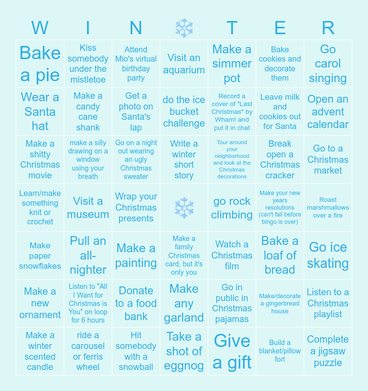 This bingo card has a free space and 53 words: Hit somebody with a snowball, Leave milk and cookies out for Santa, Have a glass of hot chocolate with marshmallows, Wrap your Christmas presents, Go on a night out wearing an ugly Christmas sweater, Go ice skating, Kiss somebody under the mistletoe, Make your own mulled wine and have a glass, Bake cookies and decorate them, Make a new ornament, Go carol singing, Watch a Christmas film, Break open a Christmas cracker, Tour around your neighborhood and look at the Christmas decorations, Make/decorate a gingerbread house, Go to a Christmas market, Wear a Santa hat, Open an advent calendar, Take a shot of eggnog, Make a simmer pot, Record a cover of "Last Christmas" by Wham! and put it in chat, Complete a jigsaw puzzle, Make a candy cane shank, Bake a pie, Give a gift, Learn/make something knit or crochet, Make paper snowflakes, Build a blanket/pillow fort, Roast marshmallows over a fire, Get a photo on Santa's lap, Put out reindeer food, Make a family Christmas card, but it's only you, Go in public in Christmas pajamas, Listen to a Christmas playlist, Bake a loaf of bread, Pull an all-nighter, Visit an aquarium, Visit a museum, Attend Mio's virtual birthday party, Listen to "All I Want for Christmas is You" on loop for 6 hours, Donate to a food bank, Make any garland, Make a shitty Christmas movie, Read a book, Make a winter scented candle, Write a winter short story, Make your new years resolutions (can't fail before bingo is over), Make a painting, do the ice bucket challenge, make a silly drawing on a window using your breath, ride a carousel or ferris wheel, go rock climbing and get high.
