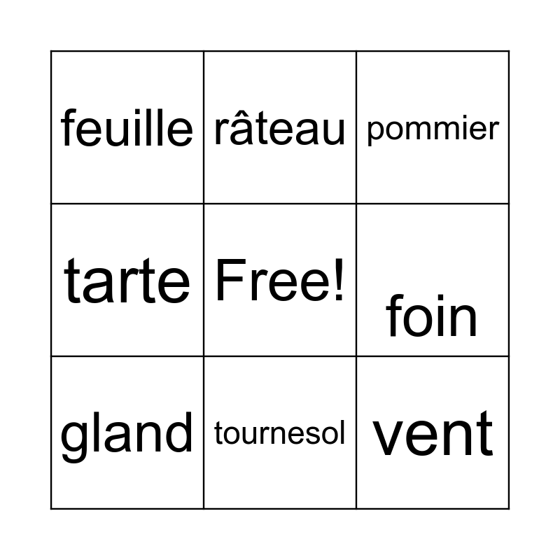 This bingo card has a free space and 8 words: foin, pommier, râteau, gland, feuille, vent, tarte and tournesol.