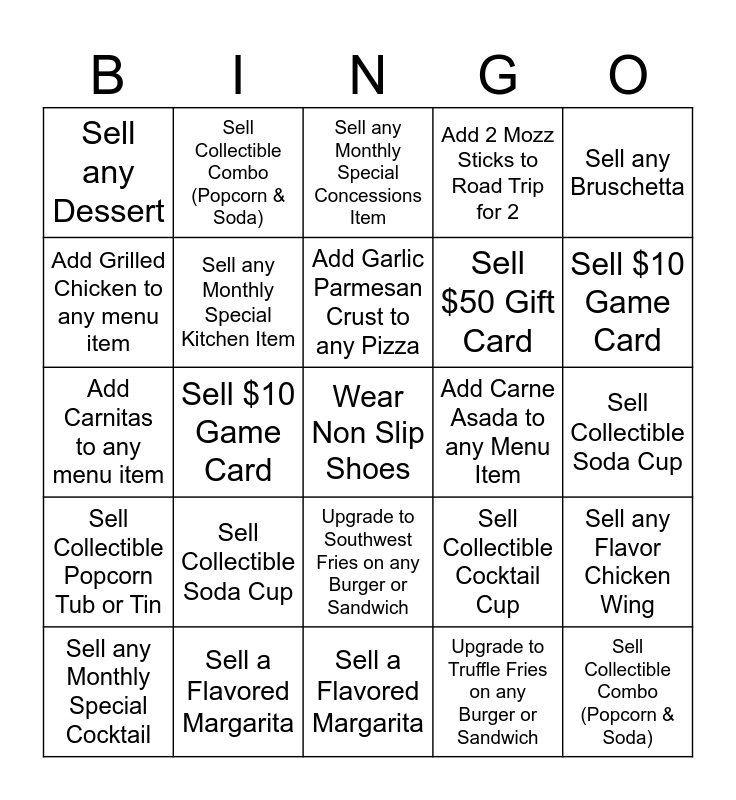 This bingo card has a free space and 26 words: Upgrade to Southwest Fries on any Burger or Sandwich, Upgrade to Truffle Fries on any Burger or Sandwich, Add Garlic Parmesan Crust to any Pizza, Sell a Flavored Margarita, Sell any Bruschetta, Sell any Dessert, Add Grilled Chicken to any menu item, Sell Collectible Combo (Popcorn & Soda), Sell Collectible Soda Cup, Sell Collectible Cocktail Cup, Sell $50 Gift Card, Add Carnitas to any menu item, Sell any Flavor Chicken Wing, Sell any Monthly Special Cocktail, Sell $10 Game Card, Sell Collectible Popcorn Tub or Tin, Add 2 Mozz Sticks to Road Trip for 2, Sell Collectible Popcorn Tub or Tin, Sell any Monthly Special Concessions Item, Sell Collectible Combo (Popcorn & Soda), Sell $10 Game Card, Sell a Flavored Margarita, Add Carne Asada to any Menu Item, Sell Collectible Soda Cup, Sell any Monthly Special Kitchen Item and Add 2 Fried Pickles to Road Trip for 2.