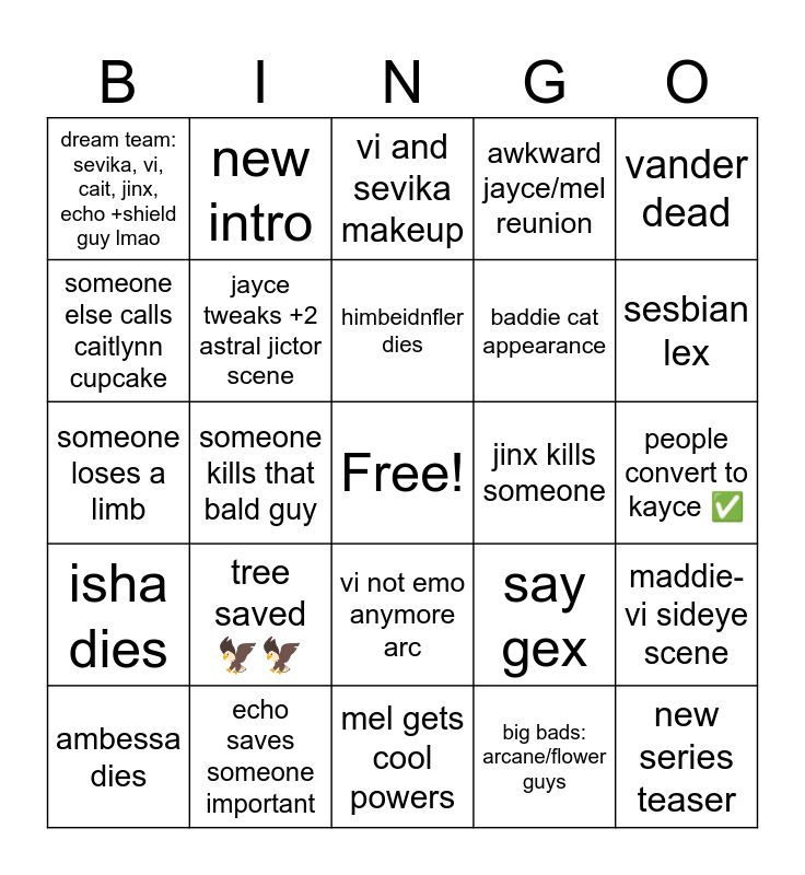 This bingo card has a free space and 24 words: tree saved 🦅🦅, echo saves someone important, himbeidnfler dies, ambessa dies, vander dead, dream team: sevika, vi, cait, jinx, echo +shield guy lmao, someone else calls caitlynn cupcake, new intro, jinx kills someone, vi not emo anymore arc, baddie cat appearance, someone loses a limb, say gex, maddie-vi sideye scene, jayce tweaks +2 astral jictor scene, big bads: arcane/flower guys, people convert to kayce ✅️, vi and sevika makeup, sesbian lex, someone kills that bald guy, new series teaser, isha dies, awkward jayce/mel reunion and mel gets cool powers.