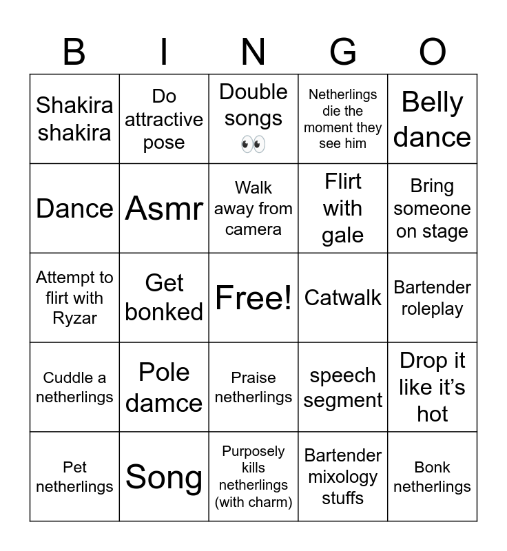 This bingo card has a free space and 24 words: Pole damce, Song, Walk away from camera, Pet netherlings, Belly dance, Shakira shakira, Dance, Do attractive pose, Catwalk, Praise netherlings, Flirt with gale, Attempt to flirt with Ryzar, speech segment, Drop it like itโs hot, Asmr, Bartender mixology stuffs, Bartender roleplay, Double songs ๐, Bring someone on stage, Get bonked, Bonk netherlings, Cuddle a netherlings, Netherlings die the moment they see him and Purposely kills netherlings (with charm).