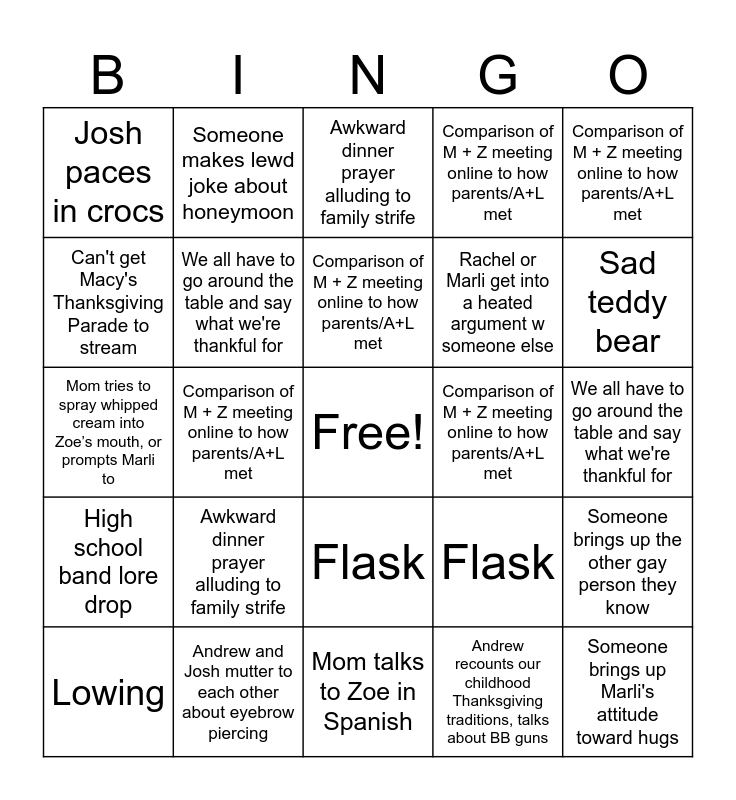 This bingo card has a free space and 52 words: Comparison of M + Z meeting online to how parents/A+L met, Someone brings up Marli's attitude toward hugs, Andrew eats with his hands, Mom talks to Zoe in Spanish, Awkward dinner prayer alluding to family strife, Andrew and Josh mutter to each other about eyebrow piercing, Someone makes lewd joke about honeymoon, Comment about future babies, Can't get Macy's Thanksgiving Parade to stream, Someone calls it the Macy's Day Parade, We all have to go around the table and say what we're thankful for, High school band lore drop, Someone brings up the other gay person they know, Flask, R + M + Z escape, Body hair comment, Comparison of M + Z meeting online to how parents/A+L met, Comparison of M + Z meeting online to how parents/A+L met, Comparison of M + Z meeting online to how parents/A+L met, Comparison of M + Z meeting online to how parents/A+L met, Comparison of M + Z meeting online to how parents/A+L met, Andrew recounts our childhood Thanksgiving traditions, talks about BB guns, Josh paces in crocs, Rachel or Marli get into a heated argument w someone else, Marli brings up politics, Someone storms out of a room, Andrew comments on buzzcut, Someone calls for a serious, private conversation, Sad teddy bear, Andrew + Lais gross PDA, Awkward question about the festivals, Comparison of M + Z meeting online to how parents/A+L met, Someone brings up Marli's attitude toward hugs, Andrew eats with his hands, Mom talks to Zoe in Spanish, Awkward dinner prayer alluding to family strife, Andrew and Josh mutter to each other about eyebrow piercing, Someone makes lewd joke about honeymoon, Comment about future babies, Can't get Macy's Thanksgiving Parade to stream, Someone calls it the Macy's Day Parade, We all have to go around the table and say what we're thankful for, High school band lore drop, Someone brings up the other gay person they know, Flask, R + M + Z escape, Body hair comment, Mom tries to spray whipped cream into Zoe’s mouth, or prompts Marli to, Someone messes up and swears, Rachel does the anime voice, Lowing and Josh talks about FSY.