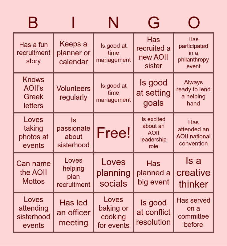 This bingo card has a free space and 70 words: Knows AOII’s founding date, Has attended an AOII national convention, Loves organizing events, Has a hidden talent, Has led an officer meeting, Can name all AOII founders, Has recruited a new AOII sister, Loves public speaking, Has participated in a philanthropy event, Can recite the objects of the Fraternity, Is a creative thinker, Knows AOII’s colors, Has a fun recruitment story, Is good at time management, Knows how to handle tough feedback, Is passionate about sisterhood, Loves planning socials, Is good at setting goals, Is always early to meetings, Can name the AOII Mottos, Is excited about an AOII leadership role, Has planned a big event, Always ready to lend a helping hand, Knows AOII’s headquarters location, Loves decorating for events, Has a leadership mentor, Knows AOII’s official flower, Has a favorite AOII memory, Is good at conflict resolution, Has attended a recruitment workshop, Keeps a planner or calendar, Knows AOII’s national philanthropy, Is an enthusiastic Big or Little, Has served as a mentor in AOII, Is a good listener, Has a pet, Knows how to run a meeting, Is a good note-taker, Has visited another chapter’s event, Knows AOII’s Greek letters, Is passionate about philanthropy, Loves helping plan recruitment, Has served on a committee before, Loves icebreaker games, Has a favorite leadership book, Volunteers regularly, Loves attending sisterhood events, Is in another club or organization, Has presented at a chapter meeting, Can name AOII’s four founders, Knows how to balance a budget, Loves giving presentations, Has an organized workspace, Can tell a funny AOII story, Loves baking or cooking for events, Has been a part of an AOII ritual, Is good at time management, Has chaired a committee or event, Has a favorite AOII tradition, Is a natural problem-solver, Loves taking photos at events, Is a skilled multitasker, Can describe AOII’s values, Has attended a sisterhood retreat, Has helped with a chapter fundraiser, Is a great brainstormer, Has traveled out of state for AOII, Has been an event host, Has a favorite AOII-themed outfit and Is great with social media.