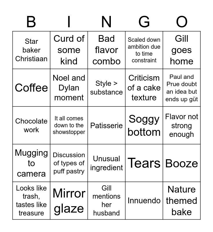 This bingo card has a free space and 24 words: Discussion of types of puff pastry, Mirror glaze, Style > substance, Looks like trash, tastes like treasure, Gill goes home, Star baker Christiaan, Coffee, Curd of some kind, Soggy bottom, Unusual ingredient, Criticism of a cake texture, Chocolate work, Tears, Booze, Noel and Dylan moment, Innuendo, Flavor not strong enough, Bad flavor combo, Paul and Prue doubt an idea but ends up güt, It all comes down to the showstopper, Nature themed bake, Mugging to camera, Scaled down ambition due to time constraint and Gill mentions her husband.