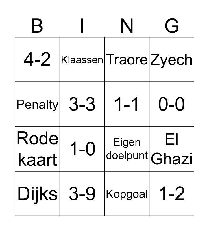 This bingo card has 18 words: 1-0, 1-2, Traore, 4-2, Eigen doelpunt, Zyech, Dijks, Klaassen, 0-0, Rode kaart, Kopgoal, Penalty, El Ghazi, 3-3, 1-1, 3-4, 3-9 and 8-8.