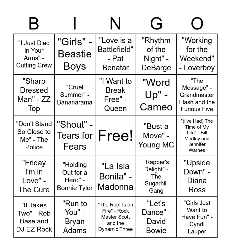 This bingo card has a free space and 40 words: “We’re Not Gonna Take It” – Twisted Sister, "Don't Stand So Close to Me" - The Police, "Ghostbusters" - Ray Parker Jr., "Cruel Summer" - Bananarama, "Run to You" - Bryan Adams, "La Isla Bonita" - Madonna, "I Want to Break Free" - Queen, "Higher Love" - Steve Winwood, "Working for the Weekend" - Loverboy, "Friday I'm in Love" - The Cure, "Shout" - Tears for Fears, "Rhythm of the Night" - DeBarge, "Girls Just Want to Have Fun" - Cyndi Lauper, "(I've Had) The Time of My Life" - Bill Medley and Jennifer Warnes, "Bust a Move" - Young MC, "Holding Out for a Hero" - Bonnie Tyler, "Walk Like an Egyptian" - The Bangles, "I Just Died in Your Arms" - Cutting Crew, "Super Trouper" - ABBA, "Love is a Battlefield" - Pat Benatar, "Upside Down" - Diana Ross, "Let's Dance" - David Bowie, "Word Up" - Cameo, "Sharp Dressed Man" - ZZ Top, "Venus" - Bananarama, "Flashdance... What a Feeling" - Irene Cara, "Faith" - George Michael, "It's Tricky" - Run DMC, "Give It Up" - KC and the Sunshine Band, "Fight for Your Right" - Beastie Boys, "Apache" - The Sugarhill Gang, "It Takes Two" - Rob Base and DJ EZ Rock, "Brass Monkey" - Beastie Boys, "Rapper's Delight" - The Sugarhill Gang, "The Message" - Grandmaster Flash and the Furious Five, "The Roof Is on Fire" - Rock Master Scott and the Dynamic Three, "Planet Rock" - Afrika Bambaataa, "Lookout Weekend" - Debbie Deb, "Girls" - Beastie Boys and "You Sexy Thing" - Hot Chocolate.