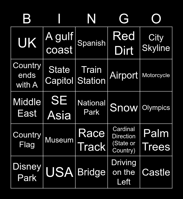 This bingo card has 58 words: Free!, USA, Europe, Country Flag, Driving on the Left, Country Capitol, State Capitol, Places we've been, Airport, Famous Monument, Red Dirt, Island, Australia, Mountains, Illinois, UK, National Park, City Skyline, Costco, Train Station, Snow, Spanish, Disney Park, Palm Trees, Southern Hemisphere, Olympics, Volcano, Lake, Motorcycle, Beach, Japan, McDonald's, Place of Worship, U.S. Embassy, City (Pop. >1mil), Ikea, Axis Power, SE Asia, Middle East, Mediterranean Sea, Museum, Castle, Cardinal Direction (State or Country), Nuclear Power, x2, Western Hemisphere, Stadium, Race Track, Bridge, Theme Park, Close to another player, Ring of Fire, Alaska, Walmart, A gulf coast, Africa, Country ends with A and Country ends with N.