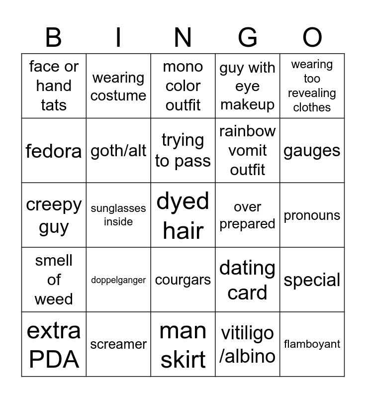 This bingo card has a free space and 44 words: land whale, flamboyant, trench coat, extra PDA, extra socially awkward, vitiligo /albino, mono color outfit, wearing animal accessories, wearing too revealing clothes, screamer, guy with eye makeup, over prepared, courgars, doppelganger, valley girl/pick me girl, man skirt, speech impediment, creepy guy, septum piercing, gauges, wearing costume, liquid courage, hitting on staff, face or hand tats, bad hygiene, pronouns, midget/dwarf, vomit/too much to drink, dating card, smell of weed, amputee, special, headband /durag, turned down, sunglasses inside, flannel/plaid, regulars, Karen, trying to pass, fedora, rainbow vomit outfit, baseball cap, goth/alt and bad wig or weave.