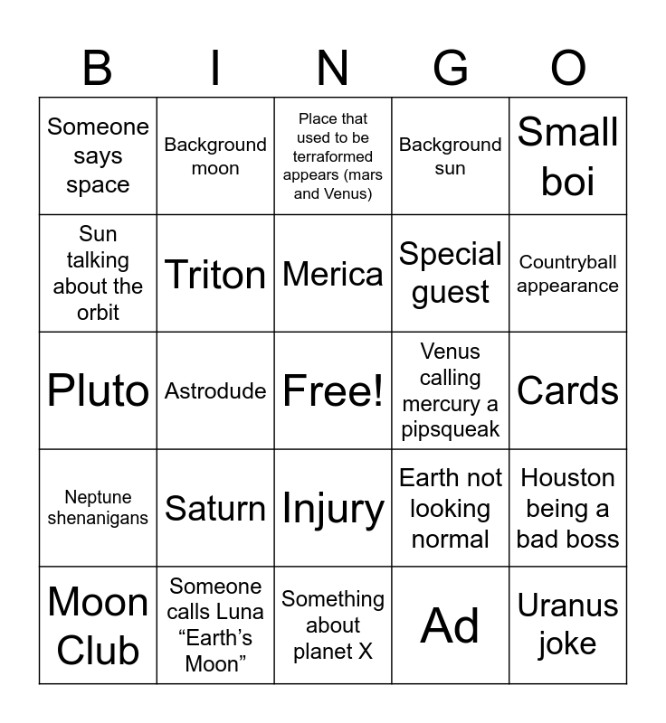 This bingo card has a free space and 29 words: Moon Club, Jupiter being a good brother, Astrodude, Earth being insecure, Someone says space, Place that used to be terraformed appears (mars and Venus), Triton, Saturn, Venus calling mercury a pipsqueak, Someone calls Luna “Earth’s Moon”, Cards, Uranus joke, Something about planet X, Ad, Countryball appearance, Earthling (besides astrodude), Injury, Neptune shenanigans, Small boi, Pluto, Earth not looking normal, Sun pun, Special guest, Sun talking about the orbit, Background sun, Background moon, Houston being a bad boss, Merica and Rocky planets chillin.