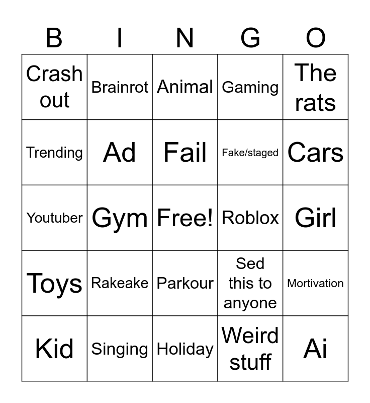 This bingo card has a free space and 24 words: Kid, Rakeake, Fail, Weird stuff, The rats, Crash out, Brainrot, Animal, Roblox, Girl, Youtuber, Ad, Sed this to anyone, Mortivation, Trending, Singing, Holiday, Gaming, Cars, Toys, Gym, Parkour, Fake/staged and Ai.