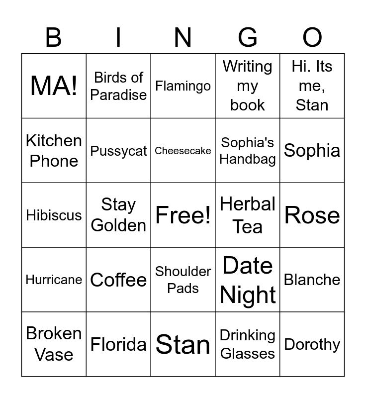 This bingo card has a free space and 24 words: Coffee, Florida, Cheesecake, Broken Vase, Hi. Its me, Stan, MA!, Kitchen Phone, Birds of Paradise, Herbal Tea, Shoulder Pads, Sophia's Handbag, Hibiscus, Date Night, Blanche, Pussycat, Drinking Glasses, Rose, Flamingo, Sophia, Stay Golden, Dorothy, Hurricane, Writing my book and Stan.