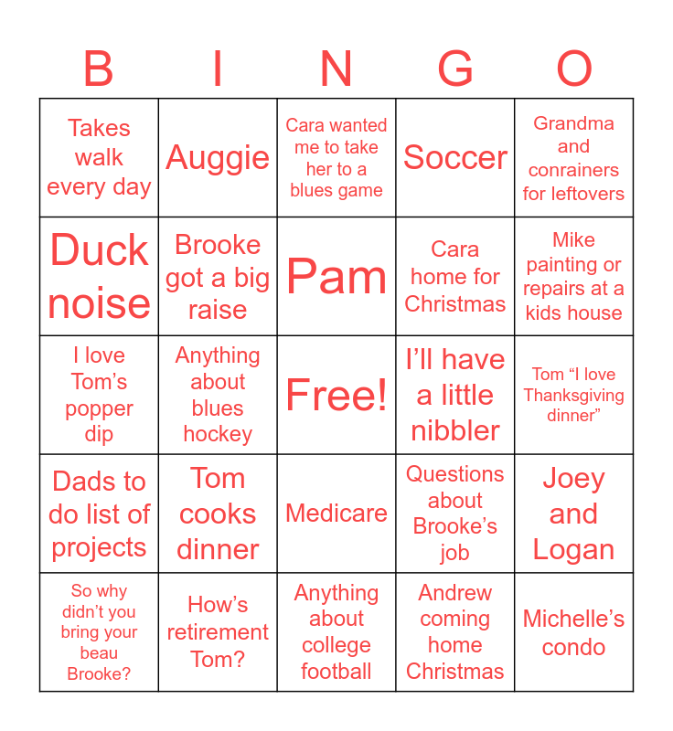 This bingo card has a free space and 29 words: So why didn’t you bring your beau Brooke?, Brooke’s new bed, Anything about blues hockey, Crock pot recipes, Takes walk every day, Cara wanted me to take her to a blues game, Brooke got a big raise, Tom cooks dinner, I’ll have a little nibbler, How’s retirement Tom?, Tom “I love Thanksgiving dinner”, Michelle’s condo, Anything about college football, Andrew coming home Christmas, Mike painting or repairs at a kids house, Any deer sausage reference, Medicare, Dads to do list of projects, Grandma and conrainers for leftovers, I love Tom’s popper dip, Questions about Brooke’s job, Where’s Kelly, Cara home for Christmas, Duck noise, Soccer, Auggie, Joey and Logan, Pam and Gobble gobble.