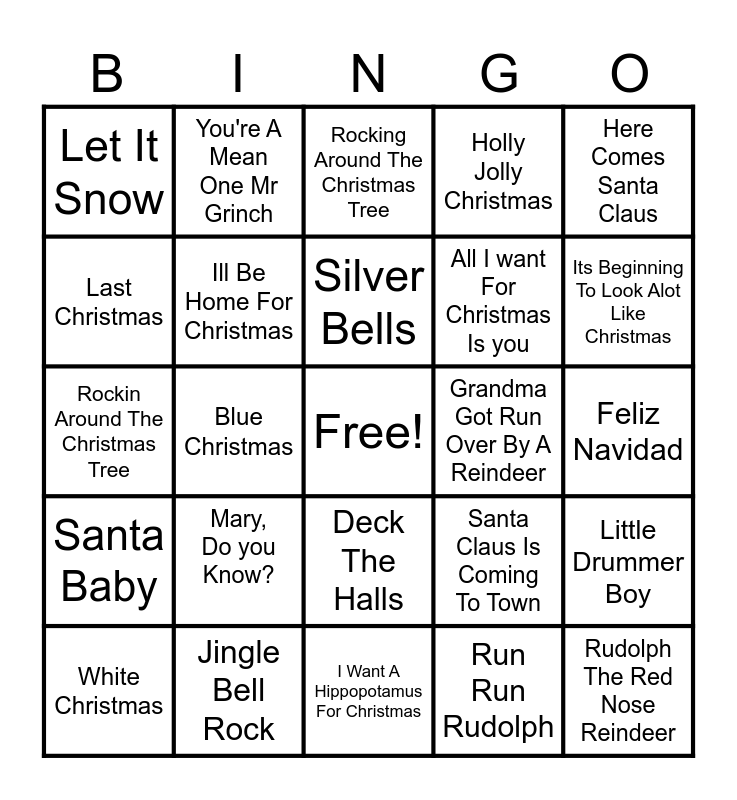 This bingo card has a free space and 24 words: Mary, Do you Know?, Jingle Bell Rock, Silver Bells, White Christmas, Here Comes Santa Claus, Let It Snow, Last Christmas, You're A Mean One Mr Grinch, Grandma Got Run Over By A Reindeer, Deck The Halls, All I want For Christmas Is you, Rockin Around The Christmas Tree, Santa Claus Is Coming To Town, Little Drummer Boy, Ill Be Home For Christmas, Run Run Rudolph, Feliz Navidad, Rocking Around The Christmas Tree, Its Beginning To Look Alot Like Christmas, Blue Christmas, Rudolph The Red Nose Reindeer, Santa Baby, Holly Jolly Christmas and I Want A Hippopotamus For Christmas.