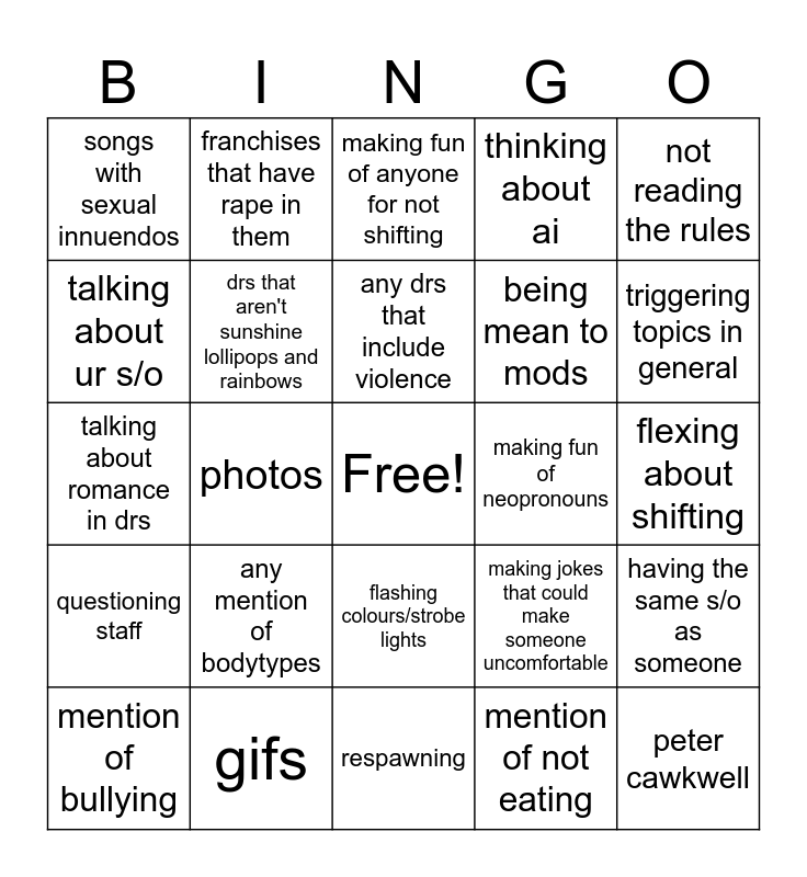 This bingo card has a free space and 24 words: mention of bullying, any mention of bodytypes, any drs that include violence, mention of not eating, not reading the rules, songs with sexual innuendos, franchises that have rape in them, making fun of anyone for not shifting, making fun of neopronouns, flexing about shifting, talking about romance in drs, drs that aren't sunshine lollipops and rainbows, making jokes that could make someone uncomfortable, having the same s/o as someone, talking about ur s/o, gifs, respawning, thinking about ai, triggering topics in general, questioning staff, photos, flashing colours/strobe lights, being mean to mods and peter cawkwell.