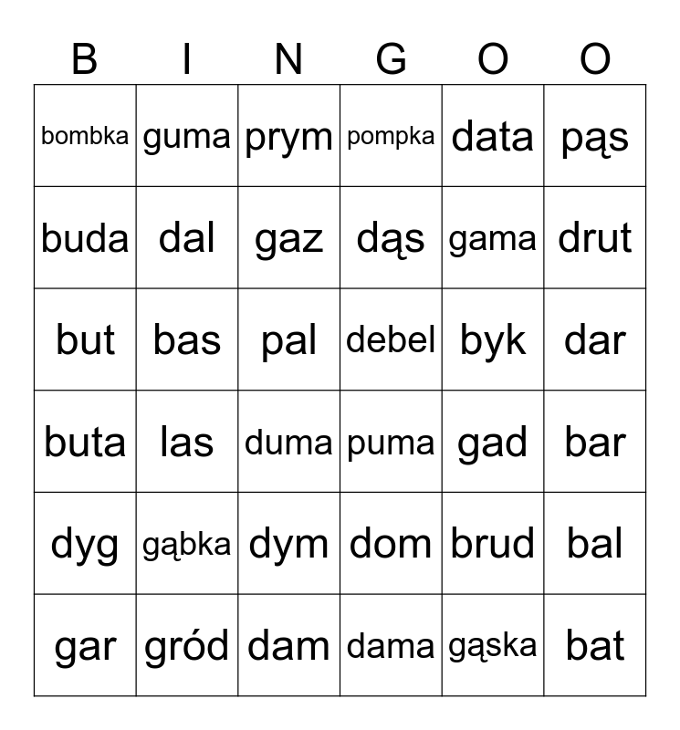 This bingo card has 36 words: dom, dym, dama, buda, buta, debel, dal, dam, data, brud, drut, pompka, bal, bas, dąs, bombka, dyg, byk, but, prym, pal, las, puma, duma, gad, guma, gama, gród, gaz, pąs, bat, gar, bar, dar, gąbka and gąska.