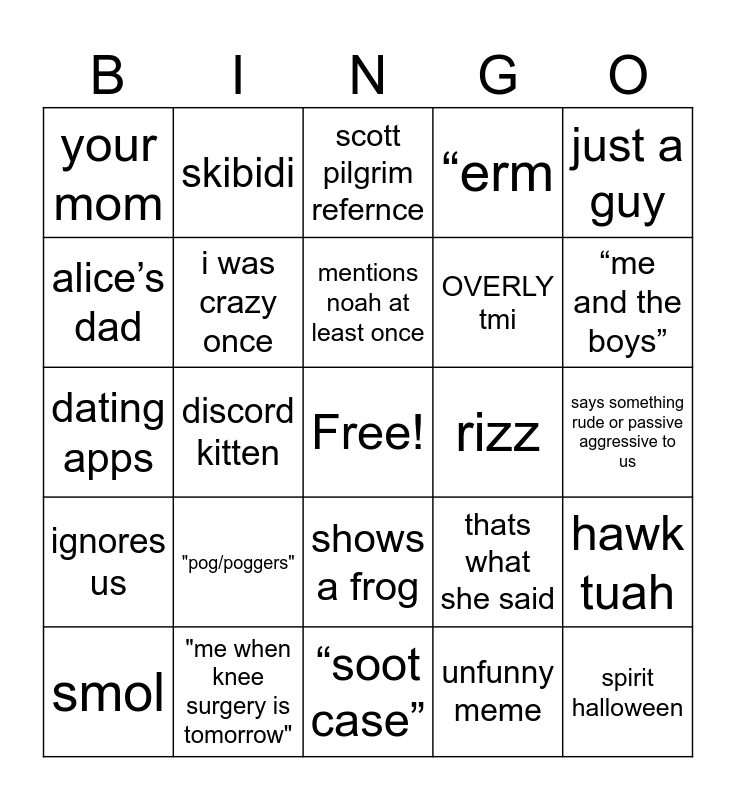 This bingo card has a free space and 24 words: "pog/poggers", "me when knee surgery is tomorrow", mentions noah at least once, smol, just a guy, your mom, alice’s dad, skibidi, rizz, shows a frog, OVERLY tmi, dating apps, thats what she said, hawk tuah, i was crazy once, unfunny meme, says something rude or passive aggressive to us, scott pilgrim refernce, “me and the boys”, discord kitten, spirit halloween, ignores us, “erm and “soot case”.