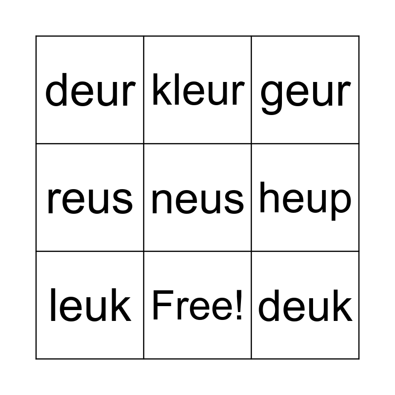 This bingo card has 10 words: Free!, geur, deur, neus, reus, leuk, kleur, jeuk, heup and deuk.