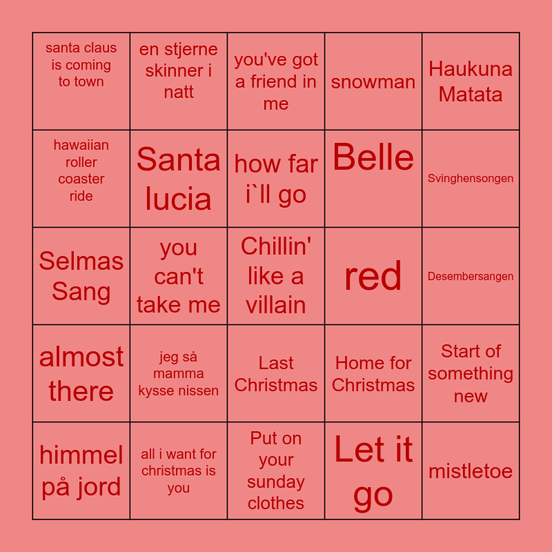 This bingo card has a free space and 24 words: jeg så mamma kysse nissen, all i want for christmas is you, how far i`ll go, himmel på jord, Haukuna Matata, santa claus is coming to town, hawaiian roller coaster ride, en stjerne skinner i natt, red, Last Christmas, Belle, Selmas Sang, Home for Christmas, Start of something new, Santa lucia, Let it go, Desembersangen, you've got a friend in me, Svinghensongen, you can't take me, mistletoe, almost there, snowman and Put on your sunday clothes.
