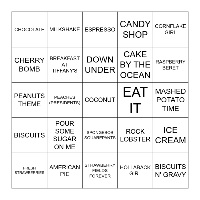 This bingo card has 62 words: A SPOONFUL OF SUGAR, AMERICAN PIE, BANANA PANCAKES, BISCUITS, BISCUITS N' GRAVY, BLUEBERRY HILL, BREAKFAST AT TIFFANY'S, BUTTER, CAKE BY THE OCEAN, CANDY GIRL, CANDY SHOP, CHEESEBURGER IN PARADISE, CHERRY BOMB, CHERRY PIE, CHICKEN FRIED, CHOCOLATE, COCONUT, CORNFLAKE GIRL, CREAM, DOWN UNDER, EAT IT, ESPRESSO, FRESH STRAWBERRIES, HOLLABACK GIRL, HUNGRY EYES, HUNGRY LIKE THE WOLF, I HEARD IT THROUGH THE GRAPEVINE, I WANT CANDY, ICE CREAM, JACK & DIANE, LADY MARMALADE, LOLLIPOP, LOW, MANEATER, MASHED POTATO TIME, MILKSHAKE, ON TOP OF SPAGHETTI, PEACHES (BIEBER), PEACHES (PRESIDENTS), PEANUT BUTTER JELLY TIME, PEANUTS THEME, PORK & BEANS, POUR SOME SUGAR ON ME, RAPPER'S DELIGHT, RASPBERRY BERET, ROCK LOBSTER, SALT, SCARBOROUGH FAIR/CANTICLE, SCENES FROM AN ITALIAN RESTAURANT, SIC 'EM ON A CHICKEN, SPONGEBOB SQUAREPANTS, STRAWBERRY FIELDS FOREVER, SUGAR, SUGAR PIE HONEY BUNCH, THAT'S AMORE, THE BANANA BOAT SONG (DAY-O), THE CANDY MAN, TOM'S DINER, TOOTSEE ROLL, TUPELO HONEY, WATERMELON SUGAR and WHAT'S INSIDE.