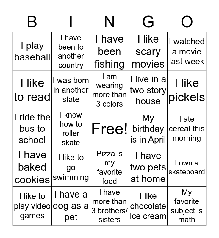 This bingo card has a free space and 24 words: I like to go swimming, I have a dog as a pet, I am wearing more than 3 colors, I like to play video games, I watched a movie last week, I play baseball, I like to read, I have been to another country, My birthday is in April, Pizza is my favorite food, I live in a two story house, I ride the bus to school, I have two pets at home, I own a skateboard, I was born in another state, I like chocolate ice cream, I ate cereal this morning, I have been fishing, I like pickels, I know how to roller skate, My favorite subject is math, I have baked cookies, I like scary movies and I have more than 3 brothers/ sisters.
